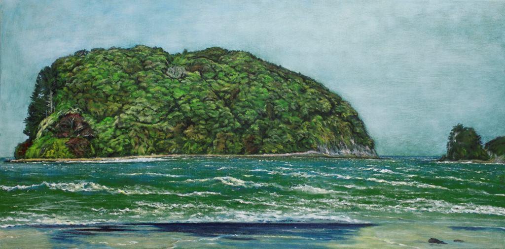 She painted two at Whangamata over January and early February. Over March to June she painted the two at Tawharanui. In October, she finished the one of Flaxmill Bay (which she had started a couple of years earlier - which posed a challenge, because the kanuka in the foreground had grown considerably).